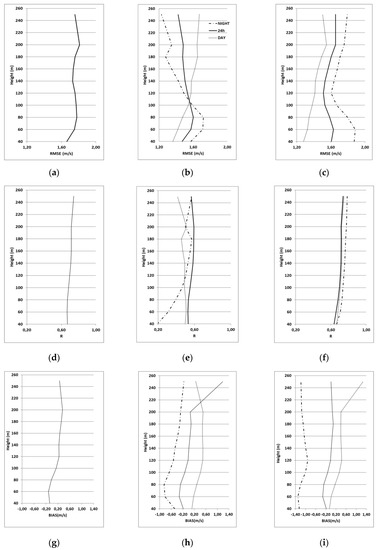 Vertical profiles of RMSE, R and BIAS between wind speed measured by the LiDAR and wind speed simulated by WRF. All days (a,d,g), breeze day (b,e,h) and synoptic flow(c,f,i) daytime and nighttime cases line (all 24 h).