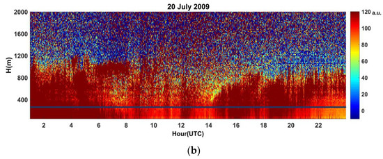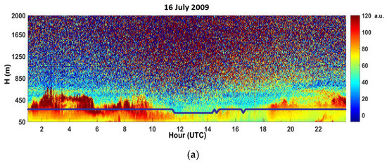 CEILOMETER CL31-10-min average of the intensity of volume backscatter coefficient (in arbitrary units) and also the wind LiDAR maximum obtainable measuring height (blue line) during a breeze day—16 July 2009 (a) and synoptic flow day—20 July2009 (b). The figure shows that the advection of cleaner air with marine aerosols from the sea with respect to the land aerosols, flowing above the IBL, after the breeze onset, causes a vertical discontinuity of aerosol concentration and thus a reduction of the LiDAR vertical range (a).