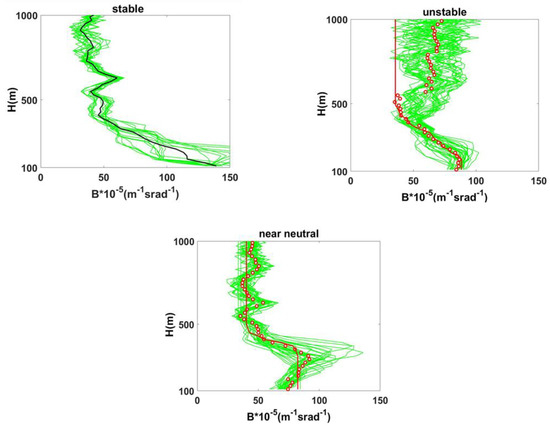Volume backscatter coefficient, B, as a function of the height, for different stability conditions: Breeze day (Top), stability classes: stable (Top-left) and unstable (Top-right); Synoptic flow near-neutral class (Bottom). The backscatter coefficients are shown in green lines, the mean of all signals in red circles and the mean of all signals for “stable” class in black line. The red lines are the fit using IBM profiles [25].