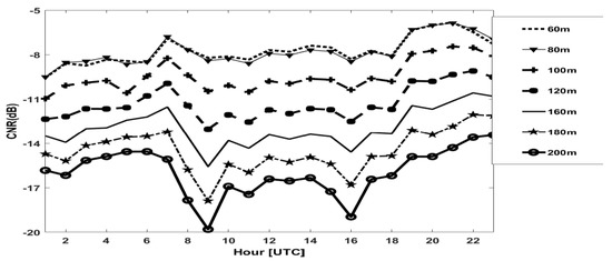 Diurnal cycle, hourly mean of CNR signals at different heights for sector 270 °during breeze regime.