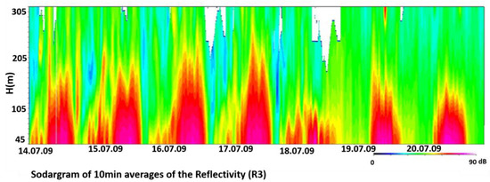 Since the working principle of the SODAR is based on density fluctuations due to the thermal structure of the Boundary Layer [32], here, as example, we show the reflectivity according to different meteorological conditions to highlight the thermal effects on surface. Reflectivity surface plots (sodargrams), of the z antenna represent the time series of the profiles measured for the vertical beam direction (zenith = 0°) and a frequency of 1.3 kHz.
