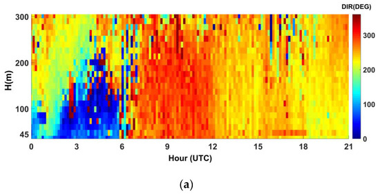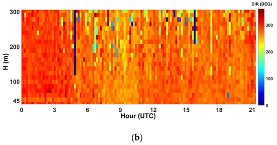 In the site, both synoptic and sea breeze regimes result in westerly winds; during synoptic flow, the wind predominantly blows from the West (270–300°) (Figure 2) with speeds higher than 4 ms−1. Both instruments exhibit a maximum around the central hour of the days (Figure 3a,b). During consecutive days of stationary sea-land breeze regime (Figure 2 and Figure 3b), we observed that after the onset of the sea breeze at around 10:00 local time, the wind speed reached the minimum value obtainable and then intensity increases and becomes stationary around 14:00 local time.