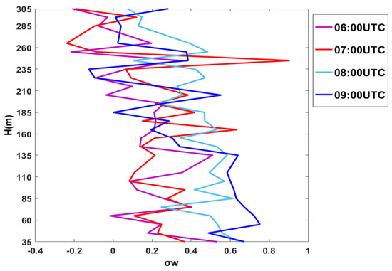 Analyzing the vertical profiles of σw, in Figure 11, around the sea breeze front passage at 07:00 UTC, we note that both σw and the temperature at 10 m increase, (Figure 2—mast measurements), while the z/L turns to negative values indicating a change towards unstable conditions.