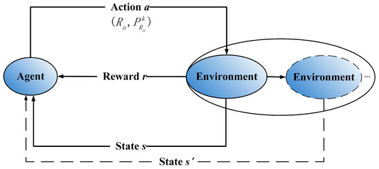 Based on the formulated optimization problem, we assume that the relay selection and power allocation process for EH-UASNs is a state transition process. The state in the th time slot is only related with the state and action in the kth time slot. It is actually a MDP [27]. The state changes discontinuously when an action is performed.