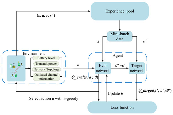 Unlike the Q-learning, the DQN algorithm does not need to establish an infinite Q-table to store Q-value. Meanwhile, it replaces the Q-table with deep neural networks which have shown the powerful ability in nonlinear fitting. Therefore, in DQN algorithm, the state space does not need to be discretized. The agent can search global optimal strategy by deepening exploration of the environment. The framework of the proposed JADQ-EH algorithm is shown in Figure 3.