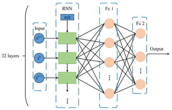 Further, Figure 4 shows the detailed structure of the RFc. In Figure 4, the RFc includes 32 RNN Cells and 2 fully connected (Fc) layers. The input of the RFc is . The hidden layer and output of RNN part employ Tanh and ReLU as activation functions, respectively. The first Fc layer has 50 ReLUs, and the second Fc layer has 3N outputs. The trick of soft update can prevent gradient disappearance and gradient explosion in training. It has been widely utilized in training RNN networks. In this study, the parameters are updated by