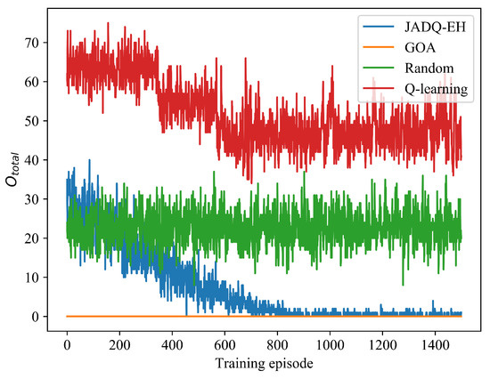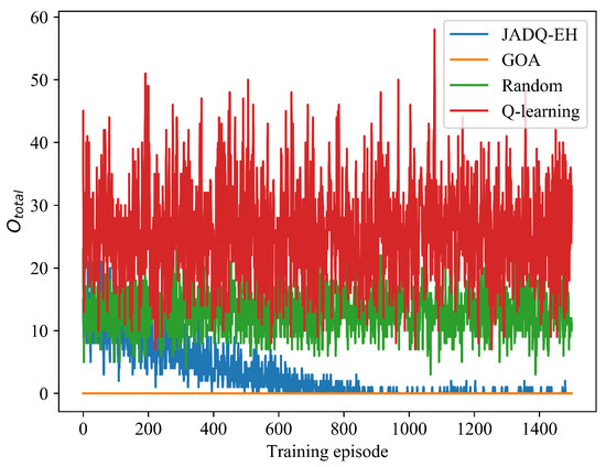 Different from scenario 1, Figure 6 shows that the Q-learning algorithm does not achieve convergence under scenario 2. The main reason is because the state space is quite large and complex under scenario 2 which has more candidate relay nodes and stronger randomness. Given that the Q-learning algorithm cannot tackle large state space, the Q-learning algorithm does not learn optimization strategy knowledge under scenario 2. With the continuous exploration and learning of the environment, achieved by the proposed JADQ-EH algorithm is close to that achieved by the GOA algorithm. The features of under scenario 2 are similar to these of Figure 5 under scenario 1. Given that the reasons of the features have been shown in the analysis of scenario 1, we do not repeat it here.