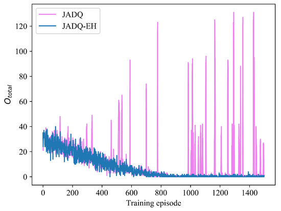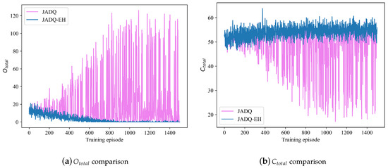 In order to verify the efficiency of proposed JADQ-EH algorithm further, the performance achieved by the proposed JADQ-EH algorithm is compared with that achieved by the JADQ algorithm which does not consider EH in reward function. Figure 9 shows the comparison between JADQ-EH algorithm and JADQ algorithm under scenario 1. The Table 7 shows the comparison between JADQ-EH algorithm and JADQ algorithm after convergence under scenario 1. In Figure 9, convergence trend of in JADQ algorithm is similar to that in JADQ-EH algorithm. However, numerous points where increases sharply are shown on the curve of JADQ algorithm, while the JADQ-EH algorithm does not. Table 7 shows that the achieved by JADQ algorithm is 17.6 times that achieved by JADQ-EH algorithm after convergence. In the proposed JADQ-EH algorithm, the is only 0.396. The main reason is because the proposed reward function in the JADQ-EH algorithm not only guarantees the optimization objective of maximizing capacity, but also considers energy utilization to reduce outages in dynamic and unknown EH-UASNs. The constructed reward function guides the agent to adequately utilize the harvested energy and charily to exploit the original battery by employing the adaptive power penalty item. The relay nodes can be prevented from overusing the battery and reserve a certain amount of battery to cope with the sudden service requests, thereby reducing .