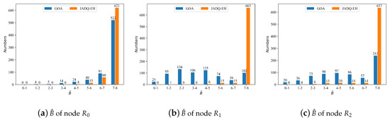 Figure 12 shows the statistical information of each node using JADQ-EH algorithm and GOA algorithm under scenario 1. The x-axis and y-axis indicate different battery levels and the corresponding number of battery levels, respectively. The maximum battery capacity of each relay node is 8 mJ. Figure 12 shows that of each relay node almost stay above 4 under the proposed JADQ-EH algorithm. It means that each node can retain at least half of at the end of every working period. On the other words, each node can store enough energy to improve the long-term service capability. However, the distribution of each node achieved by the GOA algorithm is relatively scattered. It means that number of battery levels which are at lower battery levels is more. Therefore, sudden service requests may not be served under GOA algorithm. Especially, the battery levels mainly concentrate in 7–8 mJ under the JADQ-EH algorithm. The relay nodes can tackle sudden and continuous requests with enough battery under the JADQ-EH algorithm. The main reason is because the proposed adaptive power penalty item guides the agent to adequately utilize the harvested energy and charily to exploit the original battery in the proposed JADQ-EH algorithm. The relay nodes can be prevented from overusing the battery and reserve as much battery as possible. The superiority of the proposed JADQ-EH algorithm in improving the long-term service capability is verified.