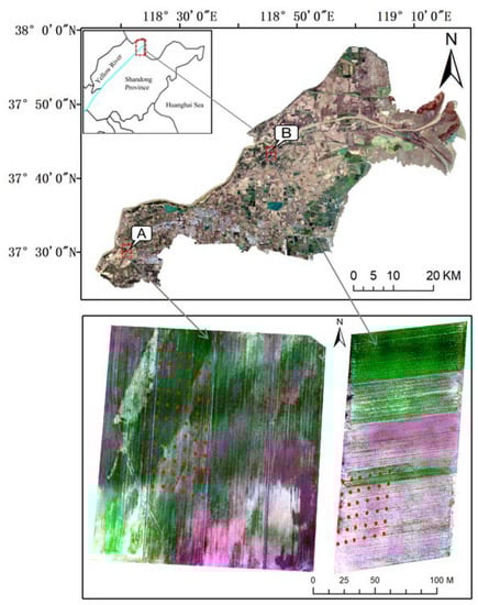 The study area is located in Kenli District (37°24′–38°10′ N, 118°15′–119°19′ E), which is the core area of the Yellow River Delta. It has a warm temperate continental monsoon climate, with sufficient sunlight but little precipitation and evaporation large, uneven droughts and floods, and obvious seasonal alternating wet and dry. The annual mean precipitation, evaporation and air temperature are 511.6 mm, 1928.2 mm and 12.4 °C, respectively [28]. The terrain of the study area is low and flat, decreasing from southwest to northeast. The source of surface water is natural precipitation and water from the Yellow River. The groundwater level is relatively shallow and the salinity is high. The main soil type is gleyic solonchaks with a high sand proportion and high salinization. Soil texture is light, organic matter is generally lack, nitrogen and phosphorus are less, soil overall nutrient is poor, the pH value of the soil is greater than 7 [29]. The main crops are winter wheat, corn, rice and cotton, but the overall management is extensive and the yield is low. Wheat planting areas are mainly distributed in the higher terrain area in the southwest and the Yellow River coast area in the northeast. The variation of soil salinization is obvious, which is an ideal area for this study. Based on the investigation of Kenli area, landform, soil and crop distribution, two test areas A and B (Figure 1) were selected for the concentrated distribution of winter wheat in the southwest and northeast of the study area respectively to carry out field soil salinity measurement and UAV flight test. Test area A was a square area of 200 m × 200 m, and a 100 m × 50 m area was selected to arrange sampling points. Test area B was a rectangular area of 200 m × 100 m, and a 50 m × 50 m area was selected to arrange sampling points. An investigation suggests that planting time, farming methods, and fertilization conditions are all basically the same in A and B test areas, while the growth of winter wheat there is obviously different, with all soil salt content levels distributed, making the experimental area more typical and representative.