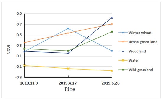 The planting area of winter wheat in the study area was extracted by using the time series features composed of the NDVI of the Sentinel-2A images on 3 November 2018, 17 April 2019 and 26 June 2019. According to the investigation and analysis of various vegetation types in the study area, only winter wheat was in the seedling stage in early November, its growth reached the peak stage in late April of the second year, and entered the maturity stage at the end of June. Its NDVI time series curve showed a rapid rise from early November to late April, while other vegetation types showed little change in NDVI, the NDVI of winter wheat declined rapidly from late April to the end of June, while the NDVI time series curves of other vegetations were in varying degrees of rising stages, as shown in Figure 2. The valley-peak-valley in the NDVI time series at the beginning of November, late April and the end of June is a significant feature that distinguishes winter wheat from other vegetation. Therefore, by calculating the changes in NDVI from early November to late April, and late April to the end of June, a decision tree is established to extract this feature. Combined with the training sample data, the following decision rules are established: