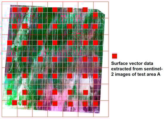 First, the 10 m × 10 m surface vector data corresponding to the size positions of Sentinel-2A image pixels were successively established in the test area A and the test area B. In order to ensure the objectivity of the data, in the formed surface vector data grid, every three rows and three columns of surface vector data are used as a unit to extract the surface vector data at the center of the unit. If the center position is not in the unit, the surface vectors at other positions in the unit are extracted. Figure 3 is the distribution map of the area vector data extracted from the test area A and a total of 75 surface vector data are extracted. The vegetation index corresponding to the Sentinel-2A image pixel of the surface vector was counted and entered into the attribute information, and the combination of the vegetation indexes were used as the input variable of the model. Secondly, A vector surface corresponds to 40,000 image UAV pixels, and the average salt value of 40,000 UAV pixels is calculated as the salt “truth value” of the surface vector data. The soil salt content of 75 surface vector data was recorded into the attribute information as the output variable of the model. Finally, BPNN, SVM and RF were used to construct soil salt content collaborative inversion model based on Sentinel-2A image. All three methods were implemented in MATLAB R2016b.The BPNN sets the number of training iterations to 1000, the accuracy to 0.003, and the learning rate to 0.02; The SVM method was set as V-SVR, and the training set cross-validation and network search method were used to optimize the parameters. According to the principle of minimum variance, the penalty coefficient was determined as C = 10000, γ = 0.01; the RF method called MATLAB random forest toolbox, and the parameter leaf node, Leaf = 5, and the number of trees, Ntrees = 300, was finally determined by Bayesian optimization.