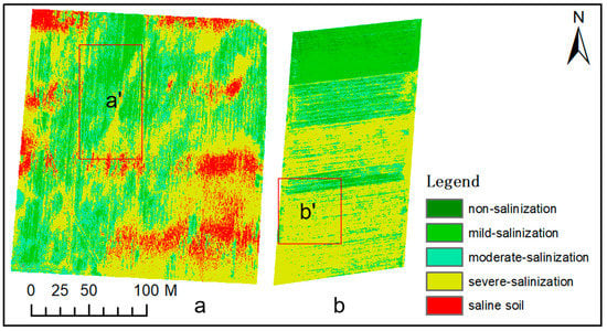 It can be seen that all three inversion models show good stability, with their Rm2 and Rv2 both exceeding 0.6, and there is no “overfitting phenomenon”. The highest modeling Rm2 of the RF algorithm is 0.878, which is 0.089 and 0.27 higher than the Rm2 of the BPNN and SVM algorithms, and the RMSEm is the lowest of 0.511, which is 0.159 and 0.38 lower than the RMSEm of the BPNN and SVM algorithms, respectively. From the validation results, the highest Rv2 of the RF algorithm is 0.827, which is 0.16 and 0.226 higher than the Rv2 of the BPNN and SVM algorithms, and the RMSEv is the lowest 0.473, which is 0.216 and 0.340 lower than the RMSEv of the BPNN and SVM algorithms, respectively. The inversion model of the RF algorithm has the highest accuracy. Therefore, The RF inversion model was selected to conduct soil salinity inversion for UAV images in the test areas A and B, and the salinity levels were divided according to five levels to obtain the distribution diagram (Figure 4a,b). Figure 4a,b are the interpolation maps of the measured soil salinity in the sampling area. Generally speaking, the inversion results of the wheat field soil salinity are basically the same as the interpolation results of measured data, and the change trend of the area proportions of each grade is roughly the same, but in comparison, the reflection of the inversion results on spatial distribution of soil salinity is more refined. Therefore, the soil salinity inversion model of winter wheat based on RF is better and has the best stable effect.
