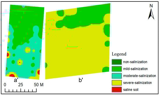 Salinity inversion map (a,b) and regional interpolation map (a’,b’) of sampling points in the test area.