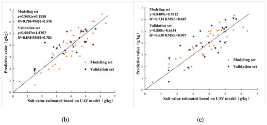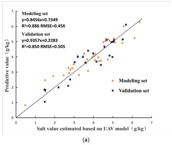 The soil salt contents in the study area vary greatly, so the smaller the pixel and the closer the sampling point, the more accurate the information reflected. In this study, an inversion model was built based on the measured ground data and UAV images. The salinity value obtained from the inversion was regarded as the “salinity truth value”, one pixel of Sentinel-2A corresponds to 40,000 UAV pixels, the average value of the soil salinity corresponding to these 40,000 UAV pixels was calculated, which was used as the salt value corresponding to the pixel of Sentinel-2A. Compared with the salt value measured on the ground, the “true salt value” is a more comprehensive representation of the true salt status in the Sentinel-2A pixel. Most of the previous studies have realized the up-scaling inversion method of UAV model by establishing the relationship of spectral information between UAV image and satellite image [5,50]. The method in this paper is a collaborative inversion model based on satellite images which is constructed by taking the UAV “salt truth value” as the bridge of “Satellite-UAV-Ground” collaborative inversion. It can better maintain the information content and spatial structure characteristics of the original remote sensing data, and better guarantee the accuracy of salt inversion. It is an effective way to realize the integrated inversion of “Satellite-UAV-Ground”.