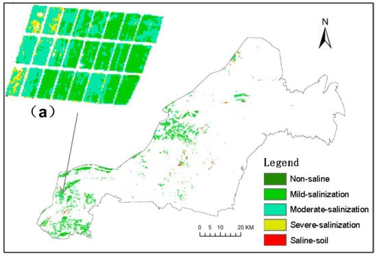 However, satellite imagery is greatly affected by factors such as fixed orbit, time phase, weather, etc., especially the low spatial resolution and imaging quality, and it often fails to meet the demand of high-precision and real-time monitoring of soil salinization [4]. In recent years, UAV technology has rapidly developed, due to its advantages of high image accuracy, simple operation and flexibility, it has been applied to soil salt monitoring by scholars [20,21,22]. However, UAV technology has some limitations in monitoring soil salinization on a large scale due to its limited observation range. Therefore, it is necessary to make use of the complementarity of “Satellite-UAV-Ground” multi-scale data to carry out collaborative inversion of soil salinity.