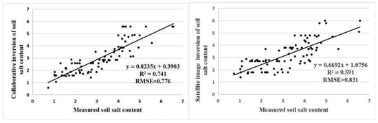 In order to further compare the inversion results of the “Satellite-UAV-Ground” collaborative method and the direct satellite remote sensing method, the salt values of 77 sampling points in Kenli District at the two inversion results were extracted and compared with the measured data. As is shown in Figure 8. The R2 = 0.741 and RMSE = 0.776 of the “Satellite-UAV-Ground” collaborative inversion results and the measured values, while the R2 = 0.591 and RMSE = 0.831 of the satellite remote sensing method and the measured values, indicating that the results of the “Satellite-UAV-Ground” collaborative inversion are highly consistent with the measured salinity, and the direct satellite remote sensing inversion results have a large deviation.