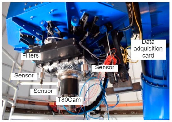 Once the preliminary study was carried out in the controlled environment, the hardware was moved to the JAO premises and installed on the T80 telescope. The T80 telescope has an 80 cm Ritchey–Chrétien mount with a 2° field of view. Its design is focused on supporting the realization of large maps, being provided with technology that compensates for temperature changes and/or mechanical bending in different parts of the telescope. The set has a weight of 2500 kg and is capable of supporting instrumentation of up to 80 kg. The current instrumentation is the T80Cam with a 9.2 k × 9.2 k pixel CCD and a pixel size of 10 µm, along with a set of 12 filters on two rotating trays [28]. Figure 1 shows the general appearance of the T80 telescope, while Figure 2 shows the detail of the T80Cam camera, filters, accelerometers, and data acquisition equipment. The accelerometers were installed on the back of the filters, just above the T80Cam and at the same height as the CCD. Due to the mechanical and dimensional characteristics of the T80Cam, it was not possible to place them on it. The three accelerometers were placed perpendicular to the XY plane in the direction of the Z axis with respect to the CCD. It was checked that the weight of the accelerometers did not show relevant incidences in the compensation of the weight of the camera. The use of a triaxial structure can generate mismatches in the instrumentation due to the high weight of three accelerometers in a single point.