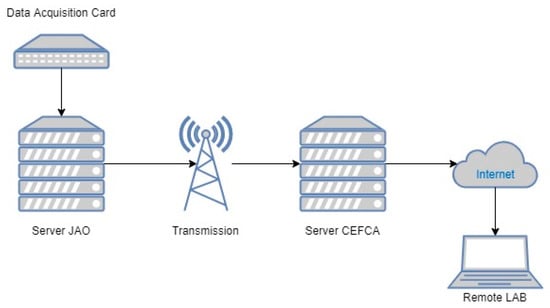 Two applications were used to operate the system, one for communication between the data acquisition card and the computer, and the second one for data processing. Data acquisition was carried out using a software platform that the manufacturer supplies for communication between the computer and the acquisition card. For the information treatment and signal processing, MATLAB (Natick, MA, USA) version 2018 was used with the “Analog input recorder” toolbox. With regard to the communication system, the data from the accelerometers located in the JAO were collected on a local server and transmitted to the server at CEFCA headquarters. The data can then be available through a computer from any remote laboratory. Figure 3 describes the communication scheme.