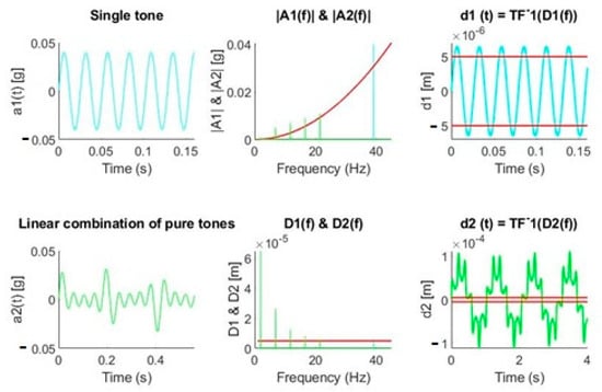 Figure 4 shows the process described for two cases of signals made up by pure tones. From the signal a1(t), we obtain the amplitude of such tone through the FFT, A1(f), and we represent it both in the acceleration and displacement graphs according to the expressions described above. Once the displacement produced by such tone has been obtained, we can visualize the instants of time in which the subpixel limit is exceeded in the temporal reconstruction. The signal a2(t), formed by the sum of tones of different amplitudes and frequencies, is converted to a frequency signal A2(f), and it is also drawn in the acceleration and displacement graphs, respectively. Subsequently, it is reconstructed, without taking into account lags, to the estimated displacement signal that would produce the initial acceleration a2(t).