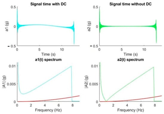 To show the aforementioned idea, we proposed synthesizing a multi tonal signal consisting of 100 very close harmonics, 0.079 Hz apart from each other, distributed between 0 and 7.9 Hz. The amplitude of the harmonics increased in the form of a ramp reaching a maximum value of 0.01 g in 7.9 Hz. Figure 5 shows how a signal over time with a DC component does not reflect the original synthesized signal (continuous tones at each multiple of the spectral resolution from 0 to 7.9 Hz and increasing amplitudes from 0 to 0.01 g). However, if we eliminate this component as well as possible, the result is that the resulting spectrum fits what is expected. We realize that, for frequencies above 1 Hz, it is necessary to eliminate the DC component to be able to synthesize an acceptable version (in green) of the former multi tone signal. Below 1 Hz, not even the elimination of the DC component serves as a strategy: it was observed that for frequencies less than 1 Hz, the spectrum values are triggered because of the division by a squared frequency that tends to zero. This led us to have to discard the frequency components lower than 1 Hz.