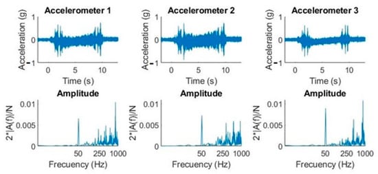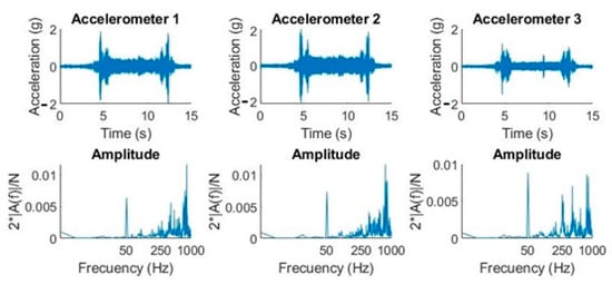 Figure 7 shows how the effect of electrical network (50 Hz) noise coupling had a significant influence in the frequency domain, but not in the time domain. The most notable collected amplitudes were in the neighborhood of 250 Hz, 400 Hz, 550 Hz, and 830 Hz, respectively.