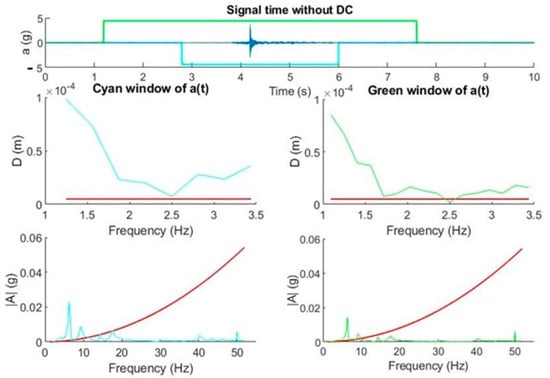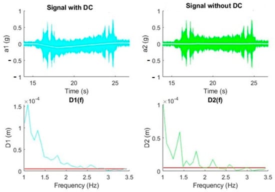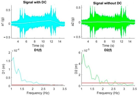 From the examples presented, we can conclude that low accelerations in the range of mg at frequencies of a few hertz affect much more than higher accelerations at higher frequencies for a given displacement. The results are in line with the work of White [29], since he determined that high frequencies could not be associated with large displacements. This fact makes it necessary to achieve a good spectral representation of frequencies in the range of 1 to 10 Hz, which becomes difficult, as will be demonstrated in the following picture, if our signal processing is not capable of eliminating the DC level.