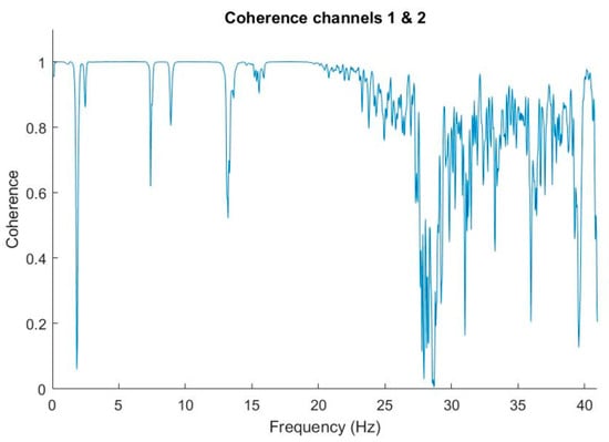 Finally, Figure 13 also shows the coherence between both channels in a very low frequency range. The coherence had a deep notch at 2 Hz and a wider one in the neighborhood of 27–28 Hz.