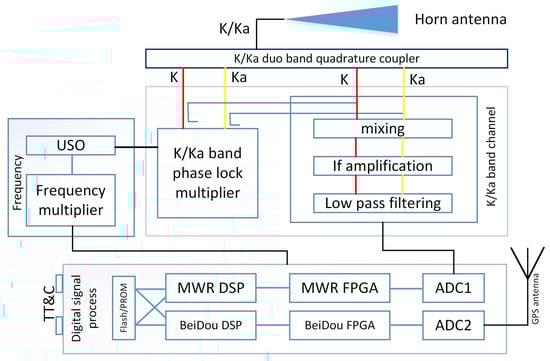 In order to ensure the time synchronization accuracy of 0.3 ns that is required by MWR, the dual-frequency navigation receiver is integrated with a K/Ka signal processing hardware platform that shares a unique USO frequency source. The hardware platform includes the MWR measurement processing module, the BeiDou measurement processing module, and the external interface module, as shown in Figure 4.