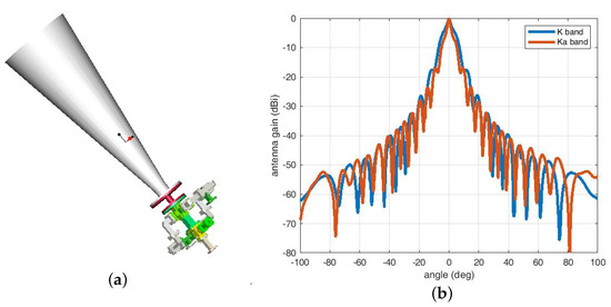 Illustration of the MWR transceiving antenna. (a) Three-dimensional antenna structure design including corrugated horn and K/Ka dual-polarization quadrature coupler. (b) Test results of the antenna pattern (radiation angle deviation from line-of-sight (LOS) direction vs. antenna gain) for both K and Ka bands.
