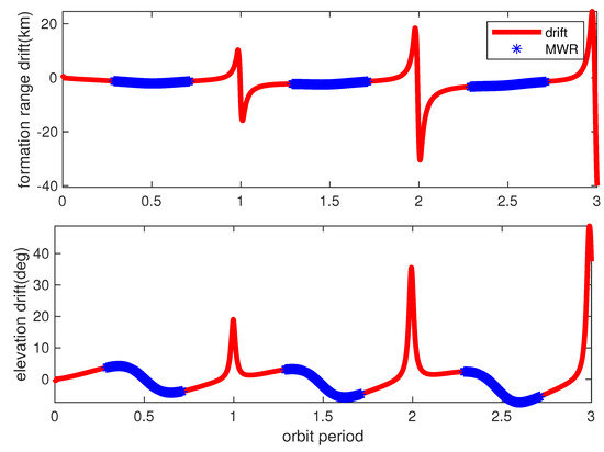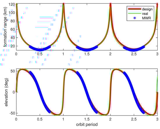 The denotations of variables/matrix , and in (14)–(17) can be found in [20], and are not explained here for brevity. For the purpose of real formation simulation, the master and slave spacecrafts are separately propagated in an inertial frame, and the relative position and velocity are computed with differences and transformed into the master RIC frame and radar system in (11)–(17), considered to be the real orbit values. Gravitational and non-gravitational accelerations are considered, with the models shown in Table 1, as: