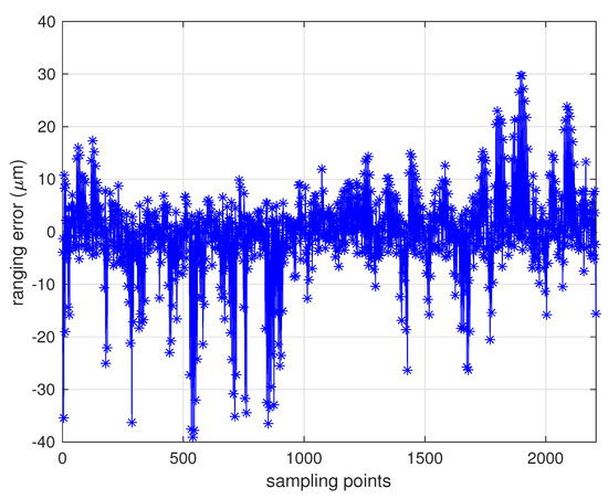 MWR ranging errors of 2400 samples, with data collected from a 6-DOF moving platform under a relative longitudinal velocity of 5 m/s. The ranging errors were less than 40 m during the test.
