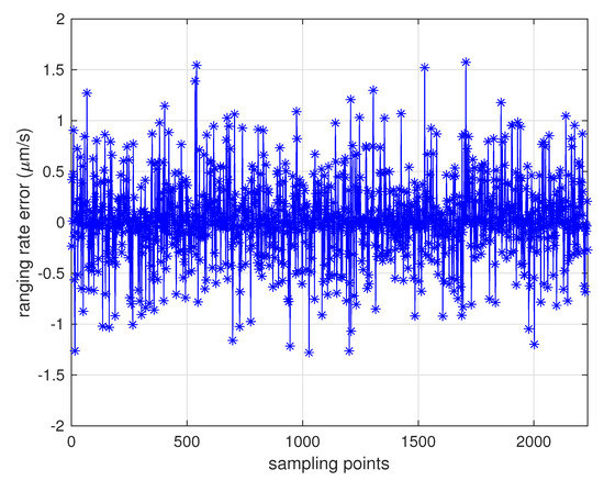 With extensive tests of MWR that were conducted in the 6-DOF platform, the results verified the micron-level high-accuracy specifications that could be applied to real space formation missions in the future. Table 3 provides the primary design parameters of the whole ranging system, with a relative distance of 100 km as an example. Figure 8 and Figure 9 provide the real ranging test results from the 6-DOF moving platform under a stable longitudinal velocity of 5 m/s. The ranging error (the differential between real measurement data from MWR and optical moving platform sensor) was less than 40 m during the test process, and 1.6 m/s range rate error was obtained.
