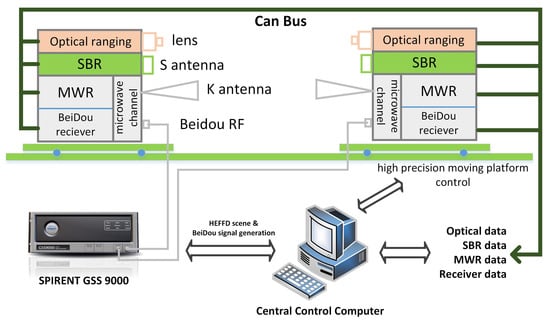 The platform was precisely installed with transmitting/receiving payloads and antennas of SBR, MWR, and optical equipment, with a guaranteed accuracy of a fixed position deviation within two microns. Figure 10 demonstrates the block diagram of the whole simulation platform used in this paper. The whole simulation system was coordinated by a central control computer, which conducted the HEFFD mission formation scenario design, high-precision moving platform control, payload operation, data collection, and analysis. Note that a state-of-the-art high-fidelity SPIRENT GSS9000 simulator was used for the generation of BeiDou B1C/B2a signals and real HEFFD mission scene. Dual-frequency BeiDou receivers from both formation spacecrafts were connected directly to the simulator for the purpose of differential carrier phase measurement and precise time synchronization with an accuracy of 0.3 ns.