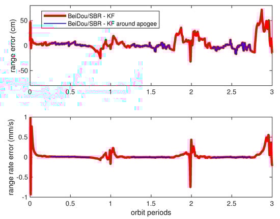 Figure 11 illustrates the estimation error (the differential of estimated values and real values from the model in Table 1) of HEFFD’s relative range and range rate by using BeiDou/SBR measurement and the traditional Kalman filter algorithm. The performance in this situation was not good, as the estimation error was divergent gradually over time, especially during perigee periods (bolded red lines in Figure 11), and converged slightly near apogee (blue lines in Figure 11). The range estimation error was up to 80 cm around perigee, and reduced to about 10 cm during apogee flight. The range rate error achieved a maximum of 1 mm/s during perigee, and 0.03 mm/s during apogee. Similar estimation performance of elevation, azimuth angle, and their rates was obtained, which will be provided later in detail.