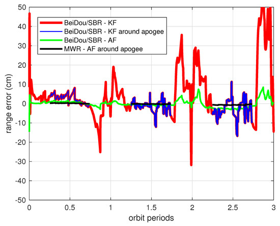 Relative range estimation errors from different payloads and filters. The red line shows the relative range estimation errors of BeiDou/SBR payload using the traditional Kalman filter algorithm (the same data as during apogee time in the blue lines); the green line represents the estimation errors of the BeiDou/SBR payload using the adaptive filter (AF); the black lines show the estimation errors of the MWR payload using the adaptive filter during apogee time.