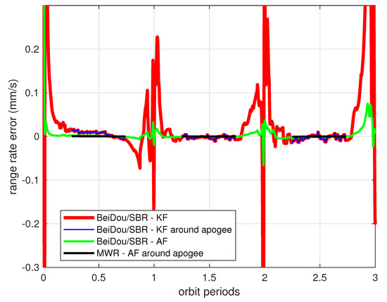 Clearly, this is not an optimal result for engineering application. The reason for the filter divergence is that the formation dynamic model used in the filter (i.e., radar model) is not sufficiently accurate for the prediction of states through recursive calculation at each sampling time. The process noise values of change consistently according to the orbit perturbations, and need to be adjusted through an adaptive approach from measurement updates. For the purpose of comparison, the data analyzed in Figure 11 are redrawn in Figure 12 and Figure 13 with new results. The green line in Figure 12 demonstrates the relative ranging errors while using the adaptive filter introduced in Section 4, from BeiDou/SBR equipment. It can be seen that the estimation accuracy notably improved during both perigee and apogee orbit time, as a result of using the process noise adaptive filter algorithm. The range estimation error was less than 10 cm around perigee, and reduced to 1 cm during apogee. The range rate estimation errors were also significantly reduced, as can be seen in Figure 13, achieving less than 15 m/s around apogee.