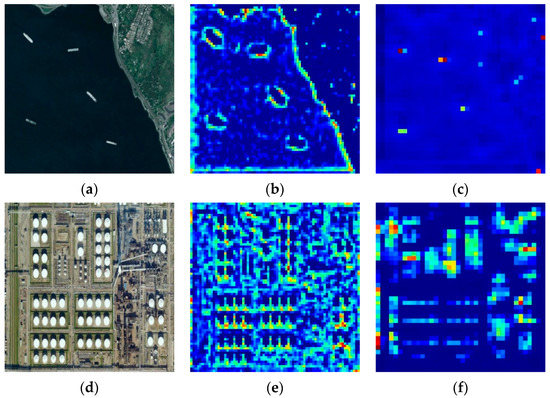 Through the feed-forward computation in the SSD, the resolutions of the high-level layers become smaller and smaller, and some features of small targets are missing. This can be demonstrated in Figure 2: small targets like Ship and Storage tank have apparent features in the feature maps with stride 4 (Figure 2b,e), but some features disappear in the feature maps with stride 8 (Figure 2c,f). Therefore, low-level features with high resolution can retain details for small targets and are specialized for detecting them. However, low-level feature maps just go through a few convolutional layers and have little semantic information, which has a negative influence on the detection performance for small targets. In contrast, as the network goes deeper, high-level feature maps extract rich semantic information of targets. We design an encoding–decoding module in Figure 4 to address this problem. The encoding stage (Encoder in Figure 4) is the feed-forward computation of our lightweight backbone, with the sizes of feature maps decreasing. During the decoding stage (Decoder in Figure 4), to reinforce semantic information for low-level features, our network up-samples high-level feature maps and adds them to low-level feature maps. The decoding stage can be formulated as follows: