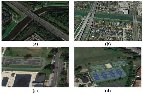 Example images with low-contrast and few-texture targets. (a,b) are images with bridges. (c) is the image with basketball courts. (d) is the image with basketball courts and tennis courts.