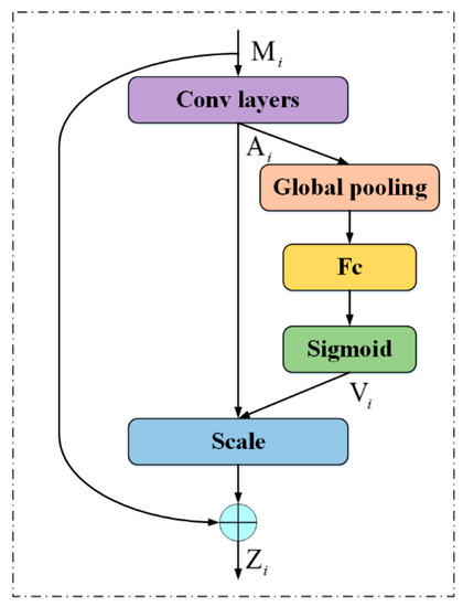Zhang et al. [33] have found that each channel of a feature map represents a sort of feature of targets. These features have different levels of importance in the detection task. As mentioned before, in the remote sensing images, there are lots of targets with few textures and low contrast, and it is hard to detect them. Some of their features are more important than others for detection. In our method, we aim to stress the important features of targets by a channel attention module, which has positive effects on detecting few-texture and low-contrast targets. An overview of the channel attention module is shown in Figure 7. The process is as follows.