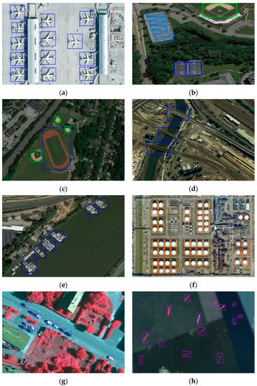 Detection results of the NWPU VHR-10 dataset. (a) Airplanes. (b) Basketball courts, Baseball diamonds, and Tennis courts. (c) Ground track fields and Baseball diamonds. (d) Bridges. (e) Harbors. (f) Storage tanks. (g) Vehicles. (h) Ships.