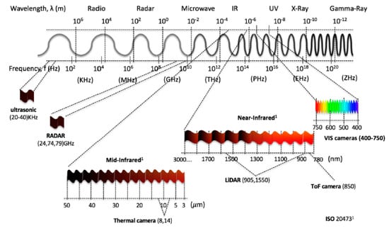 All the above features were designed to improve vehicle safety and rely deeply on sensor data. Data accuracy from the sensors depends on environmental stimuli to perceive the surrounding scene. Car sensors are classified as proprioceptive or exteroceptive. Proprioceptive sensors help measure vehicle ego movement and dynamics. Some of the proprioceptive sensors are wheel speed sensors, torque sensors, steering angle sensors, and IMUs. On the other hand, exteroceptive sensors work by detecting obstacles, and recognizing the navigation scene and help gather information from the surroundings and improve knowledge of the vehicle’s location. Exteroceptive sensors are further categorized into passive and active sensors. Active sensors include ultrasonic, radar, and lidar, which function by emitting energy in the form of electromagnetic waves or radiation and measure return time to determine parameters such as distance and position. Instead of transmitting external signals or disruptions, passive sensors (infrared cameras) receive electromagnetic waves or radiation in the environment. Active sensors are preferred to passive ones, since they have less trouble discriminating between useful data and irrelevant signals. Figure 1 shows a wide range of the electromagnetic spectrum described by ISO 20473, including the wavelength of the following sensors: CMOS camera, near-infrared sensors, lidar, thermal camera, radar, and ultrasonic sensor.
