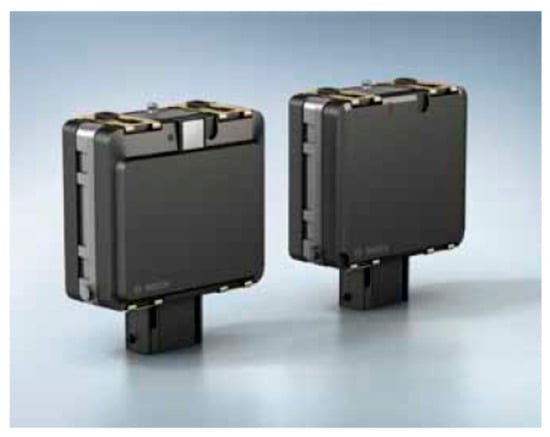 Market penetration: Radio detection and ranging (radar) provides smart vehicles with effective safety procedures. This sensing technology started with Hertz and Hülsmeyer’s electromagnetic wave reflection studies [66], and now has steadily improved from basic blind spot detectors and cruise control systems to semi-autonomous obstacle detection and braking functions [16]. Bosch, with its partnership with Infineon, is the dominant manufacturer of radar in the market. The other big players are Continental, Autoliv, Delphi, Elesys, Hella, Fujistu Ten, Mitsubishi Electric, ZF-TRW, SmartMicro, Denso, Valeo, Hitachi Automotive, Clarion, etc. Technical information on radar by various manufacturers is presented in [67]. In Figure 2, an image of radars from Bosch is presented.