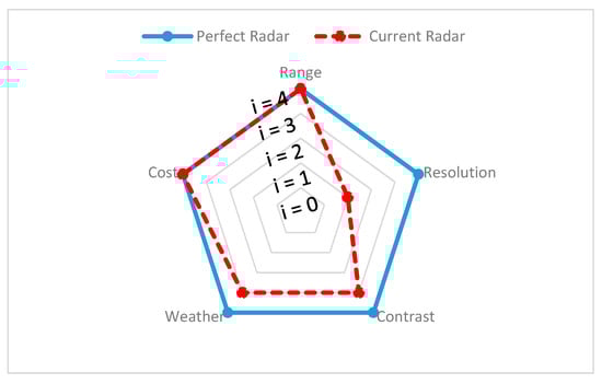 The spider chart for radar is presented in Figure 3, where the ideal radar feature is shown with the blue bold curve, whereas the actual radar sensor output is shown with the red dashed line. The difference between both curves represents the difference between the current and desired radar sensor output.