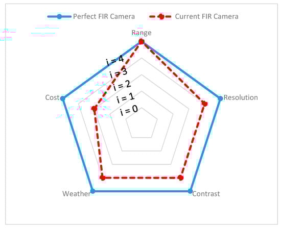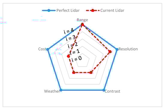 Cost: Details on the individual costs of the sensors were collected from various online sources. For instance, we have a unit price of automotive ultrasonic sensors ranging from USD 16 to USD 40 [58,59] and of automotive radar ranging between USD 50 and USD 220, based on the application for short–medium–long range [60]. The automotive lidar price ranges between USD 500 to USD 75,000, based on the design and configuration of lidar and, in 2020, Velodyne announced it would be introducing a USD 100 lidar sensor applicable for use in cars [61,62]. The automotive mono-camera price ranges between USD 100 and USD 1000 [63,64] and automotive thermal cameras cost around USD 700 to USD 3000 [65]. In order to visualize the sensors’ cost on a spider chart, we compared the actual price with the ideal price, as shown in Table 2. The ideal price is proposed by authors and depends on the actual price versus the acceptable price by considering the sensor design and complexity.