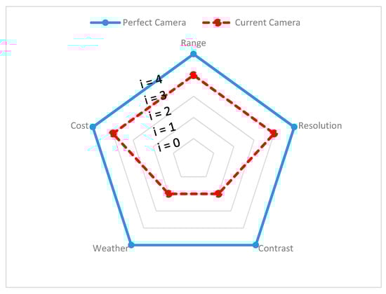 Range: Information is gathered from various sensor manufacturers and used to describe the performance of the sensors. For example, the ability of a sensor to detect any object over 100 m and above is assumed to represent high performing sensor and is represented with Index 4 (i = 4) on the spider charts to visualize this. However, if a sensor cannot detect objects at 100 m, the output of the sensor is considered as low performing, indicated with Index 1 (i = 1). For ADAS safety driving applications, range requirements may vary.