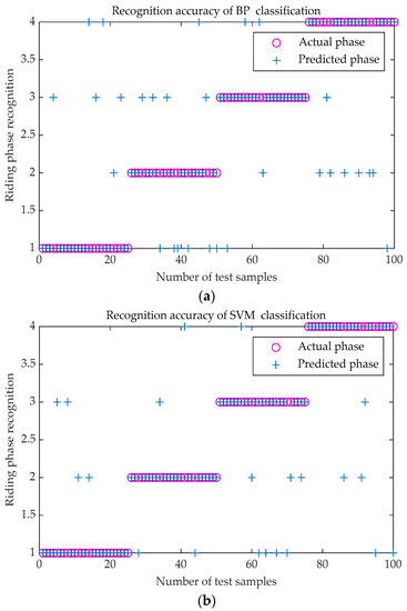 The comparison results on the testing data are shown is Figure 12. In the figure, 1 represents the pedaling phase; 2 represents the lower buffer phase; 3 represents the relaxation phase; 4 represents the upper buffer phase. The circle in the figure indicates the actual phase. Furthermore, the + indicates the recognized phase by each method. If the two symbols are coincident, the recognition is correct. Otherwise, it is wrong. The recognition rate of BP neural network classification model is 72%. That of SVM classification model is 79%. That of PSO-BP classification model is 84%. Furthermore, that of PSO-SVM is 93%. The number of recognitions for each bicycle riding phase is shown in Table 2. The precision of each SVM classification is shown in Table 3. The recall of each SVM classification is shown in Table 4. The F1-score obtained by each SVM classification is shown in Table 5, and the G index is shown in Table 6. The PSO-SVM classification model shows the best correct rate.