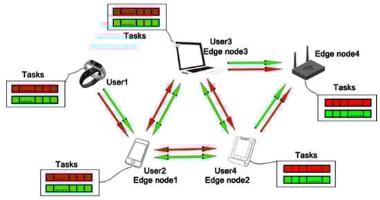 In the traditional edge computing structure, the remote cloud center, edge nodes and users form a close relationship through the networks. However, considering the data security and privacy of smart homes, avoiding the hosting costs incurred by uploading tasks to the cloud center and reducing the latency of smart home applications, we design a new edge computing structure for the smart home that does not require the involvement of cloud center. As shown in Figure 2, the user represents a smart home application whose capacity does not meet the task requirements and the edge node is a smart home application at the bottom of network structure that has spare computing power and provides the compute and storage resources for its surrounding users. The arrow direction represents the tasks generated by users that are processed by nearby edge nodes. Their spare computing power eliminates the need to transmit data to the cloud center and decentralizes processing power to ensure real-time processing with reduced latency, while diminishing bandwidth and network storage requirements. In fact, many smart home applications both act as users sending task requests to surrounding edge nodes and as edge nodes receiving and resolving tasks from surrounding users in a smart home environment. For example, a mobile phone can act as an edge node between a smart bracelet and a cloud center, processing service requests from the bracelet about exercise and health monitoring, and as a user generating tasks about games, videos, social networks, et al. However, the tasks generated by users can only be processed by the adjacent edge nodes in a smart home environment due to the lack of cloud center. For the purpose of processing various tasks in different strategies properly, the tasks generated by users or received by edge nodes are divided into two types. As shown in Figure 2, the red tasks represent the tasks with high requirement on latency and low requirement on processing capacity (For example, game commands in phone, shopping online by Taobao VR) and the green tasks represent the tasks with low requirement on latency and high requirement on processing capacity (For example, watching HD video on Smart TV). By adopting different processing strategies for the two kinds of tasks, the model can take advantage of the relationship of edge nodes and users to solve resource allocation in edge computing without the participation of cloud center.