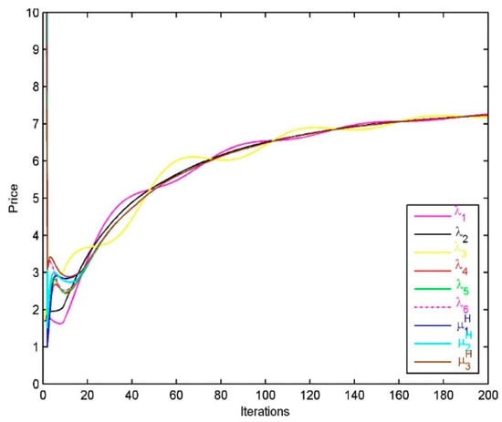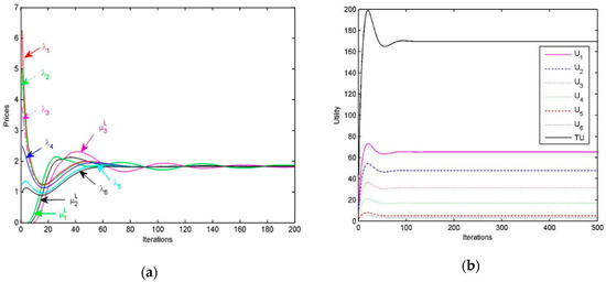 The prices paid by the 6 resource customers are shown in Figure 4a, we find that the prices are finally driven to be an equilibrium, that is, . The prices charged by the 3 providers for upload links are , and at the optimum . After a certain number of iterations, the prices charged by providers for upload links and the prices paid by customers are equal, namely .