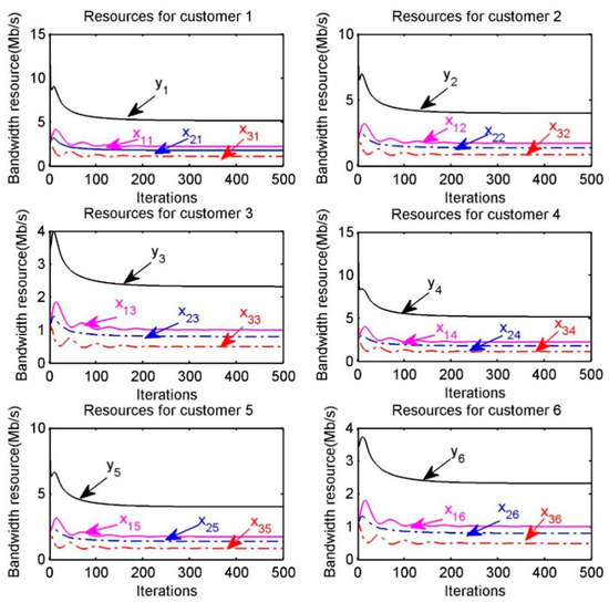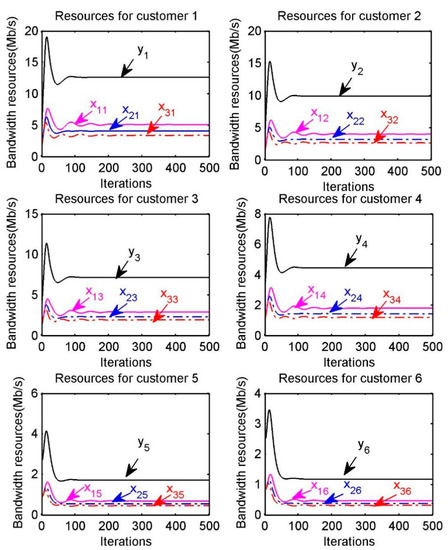 The optimal resource allocation for each customer is also shown in Figure 5, where represents the amount of bandwidth resource provided by provider to customer , is the amount of bandwidth resource received by each customer . For example, in the “Resources for customer 1” of Figure 5, respectively represent the amount of resource provided by providers to customer and represents the total amount of bandwidth resource obtained by the customer . We can find that the optimal resource allocation can be achieved within a certain number of iterations.